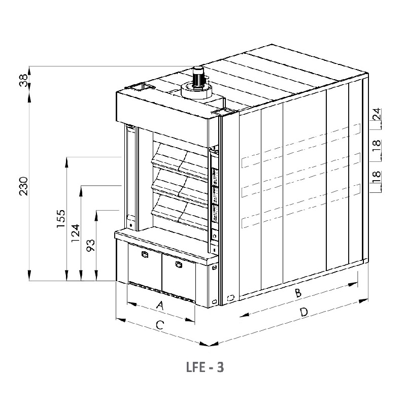 - Portes: Portes battantes. Sur demande, portes équilibrées avec fermeture automatique pour enfourneurs intégrés (ou élévateurs) ou portes relevâtes avec ouverture vers le haut.