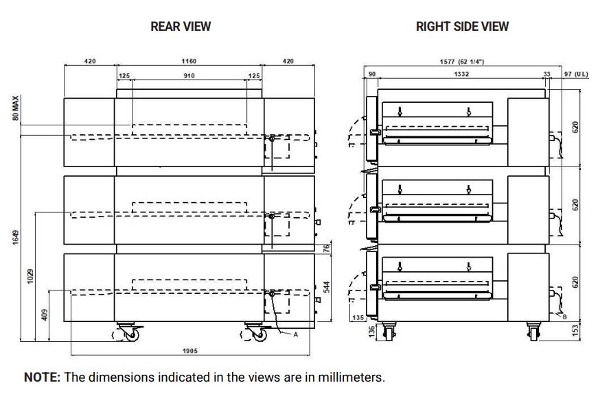 Avec des dimensions extérieures de 2050x1460x2010 mm et une surface de cuisson de 0,74 m², ce four convoyeur offre une capacité impressionnante de 375 pizzas de 30 cm par heure ou 144 pizzas de 45 cm, idéal pour les pizzerias à fort trafic. Son système de cuisson précis et efficace est alimenté par une puissance de 65,4 kW et une tension de 400 V, permettant de cuire vos pizzas à une température maximale de 320°C (608°F). Le four est conçu pour offrir des performances exceptionnelles, même dans des conditions de travail intenses.