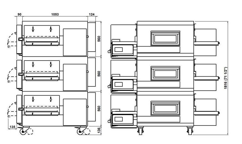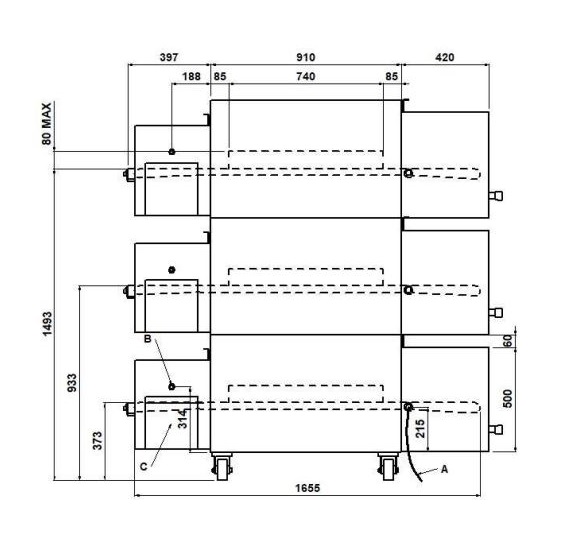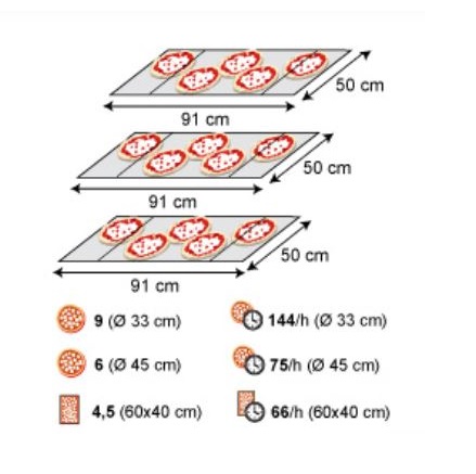 - Dimensions intérieures (LxPxH) : 3x910x500x80 mm, offrant une capacité idéale pour cuire jusqu'à 9 pizzas de 33 cm en un seul passage.