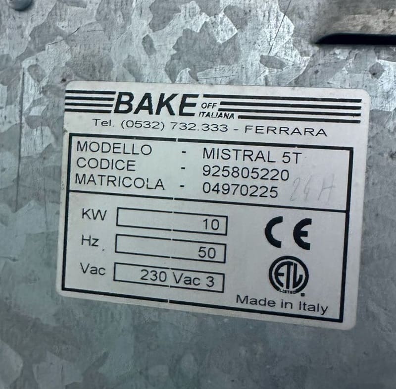 Offrez à votre cuisine professionnelle la polyvalence et la performance du Four à Convection Électrique 5 Plateaux Bake Off Mistral 5T d'occasion, le tout au meilleur prix. Conçu par la marque de renommée mondiale Bake OFF ITALIANA, ce modèle MISTRAL 5T, doté du numéro de série 925805220, est équipé de 5 plaques de 40x60 et 46x66 cm pour répondre à tous vos besoins de cuisson. Ses dimensions extérieures compactes, mesurant 800 L x 1150 P x 670 H mm, en font un choix optimal pour les cuisines professionnelles. Avec une distance de 90 mm entre les plaques, une puissance de 10 kW et une alimentation en TRI/230V/50Hz, ce four offre une performance exceptionnelle à un prix avantageux. Faites l'acquisition de cet équipement de qualité pour sublimer vos créations culinaires