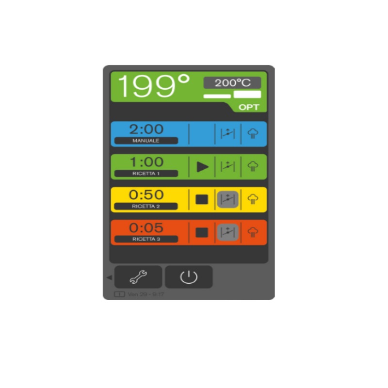L'association d'images à chaque recette facilite davantage l'utilisation de l'écran tactile, rendant la gestion du four plus intuitive et conviviale. Grâce à l'écran couleur, surveillez aisément l'état du four, de la phase de chauffage à la fin de la cuisson. Cette fonctionnalité permet d'optimiser vos processus de production, de réduire les coûts d'exploitation et d'améliorer l'efficacité de votre atelier, même à distance.