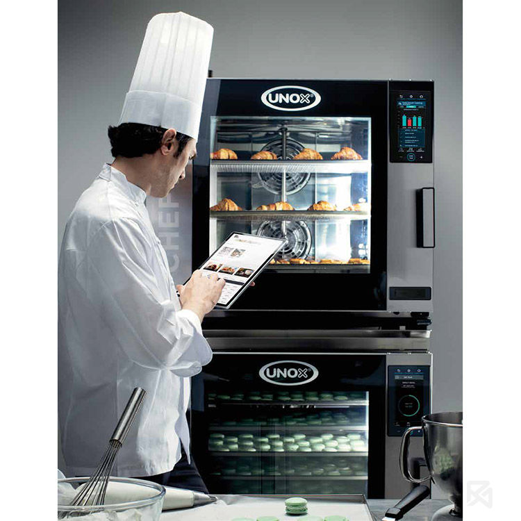 Fours mixtes professionnels intelligents capables de gérer les processus de cuisson des produits de boulangerie et de pâtisserie (frais et surgelés) et de multiples processus de cuisson (déshydratation, cuisson à la vapeur, cuisson à basse température, cuisson sous vide, rotissage, grillage, friture, régénération et régénération sur plaque). Grâce aux technologies Unox Intensive Cooking et Unox Intelligent Performance qui garantissent des résultats parfaits et une reproductibilité pour toute type de charge. Gestion automatique des processus de cuisson (CHEFUNOX) pour des résultats parfaits même sans personnel qualifié.