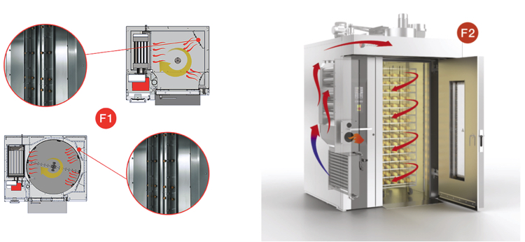 -Le flux d'air chaud à l’intérieur de la chambre est très important pour la bonne réussite du produit final, qui devra avoir une couleur et un développement uniforme sur tout le chariot. Pour les modèles 8080, 80100, 80120, 100130, comme aide aux fentes, il y a des volets réglables (F1) pour diriger le flux afin d'obtenir un équilibre optimal de la cuisson sur toute la surface du chariot. (F2)