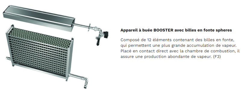 Placé en contact direct avec la chambre de combustion ou des résistances électriques, l’appareil à buée est constitué par de modules superposés et démontables qui en facilitent l’entretien.