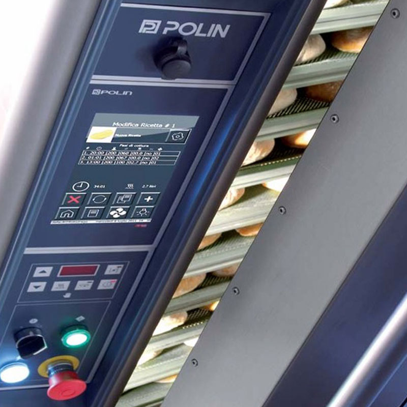 Le four est équipé d’un système de rotation standard avec embrayage et crochet, assurant une rotation fluide et constante du chariot pendant la cuisson. Cette technologie améliore la répartition uniforme de la chaleur, garantissant des résultats homogènes pour tous les produits.