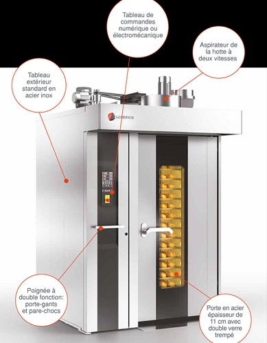 En acier inox d’une épaisseur de 11 cm, verre trempé. Robuste et résistante, elle est isolée à l’intérieur par laine de roche. La poignée en aluminium anodisé, au design original et innovant, distingue toute la ligne des fours rotatifs en leur apportant qualité et originalité.