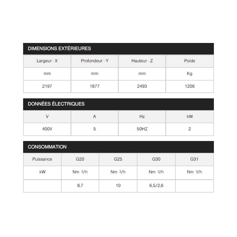 | Énergie | Gaz propane G31 ou gaz naturel |