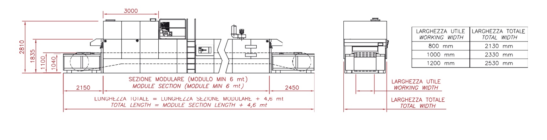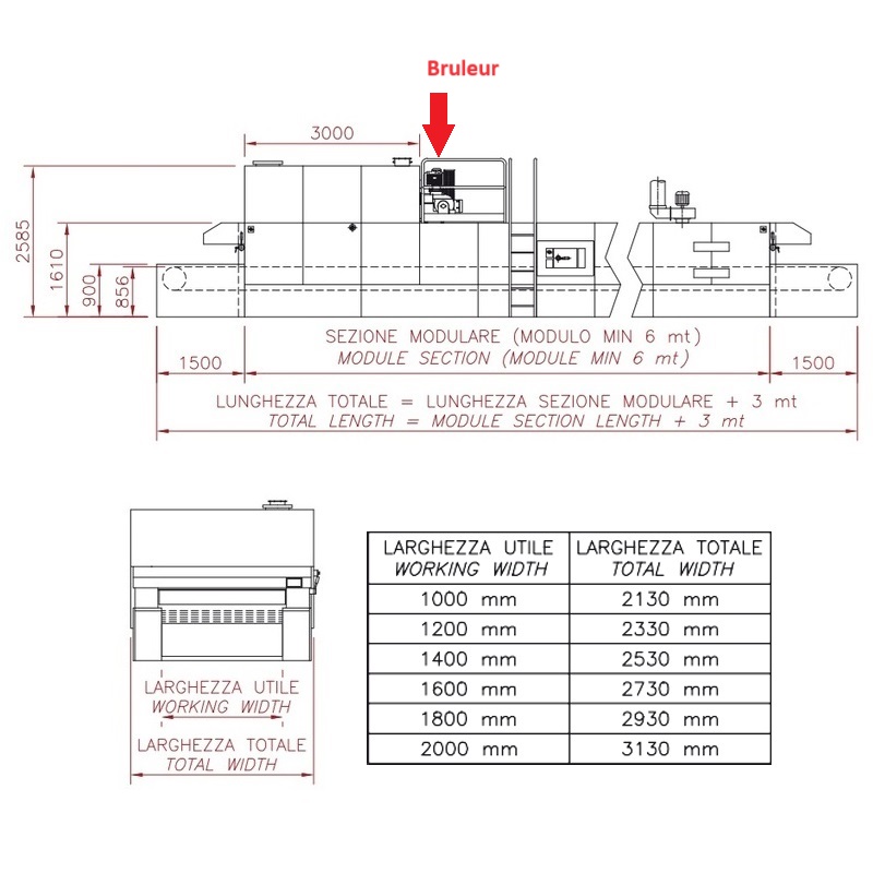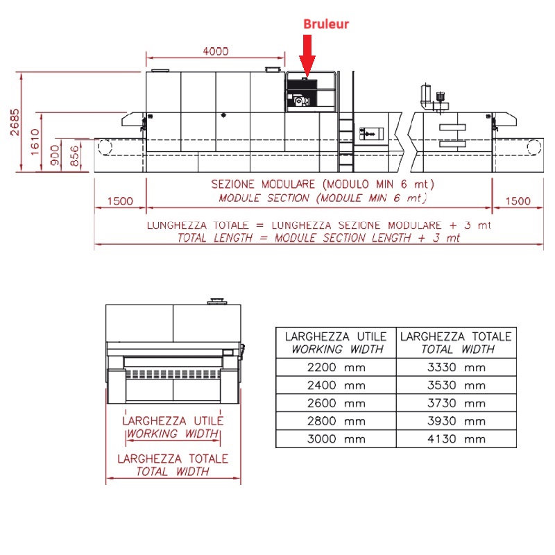 Équipé de vannes pour le réglage indépendant de la voûte et de la sole, ce four assure un contrôle précis de la température pour une cuisson homogène. Le nombre de zones de chauffage est adapté en fonction de la longueur du four, tandis que la largeur peut être ajustée selon les besoins spécifiques de production.