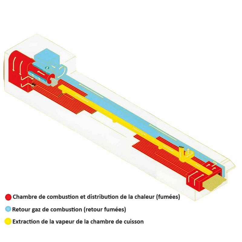 Le système de chauffage cyclothermique à vide garantit que les gaz de combustion réchauffés ne contaminent pas le produit dans la chambre de cuisson. Cela permet une cuisson uniforme et de haute qualité pour une variété de produits.
