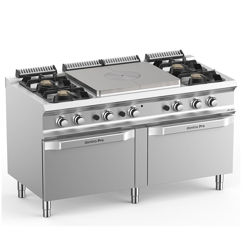 Le Fourneau 4 Feux Vifs avec Plaque Coup de Feu et 2 Fours MBM TPG7152FG4XL est une solution complète pour les cuisines professionnelles, offrant une grande capacité de cuisson avec quatre feux vifs, une plaque coup de feu, et deux fours. Avec une puissance totale de 50 kW, ce fourneau est idéal pour les établissements nécessitant une performance élevée.