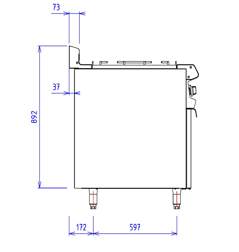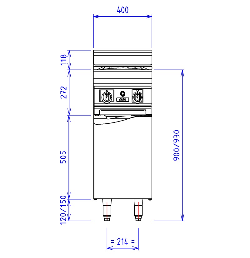 Les dimensions extérieures de ce fourneau sont de 400 x 925 x 900 mm, offrant un espace de cuisson compact mais efficace. La carrosserie en acier inoxydable 18-10 brossé garantit une robustesse et une longévité optimales. Le dessus a une épaisseur de 30/10ème, et l'habillage en acier inoxydable brossé est de 10/10ème, avec une structure interne de 20/10ème. Le piétement vérin composite de 150 mm est réglable en hauteur, assurant une stabilité parfaite. Les bords avant sont tombés et rayonnés de 20 mm, tandis que les bords arrière forment un dosseret et une mitre d’évacuation. La façade sans vis apparentes offre une finition élégante et facile à nettoyer.