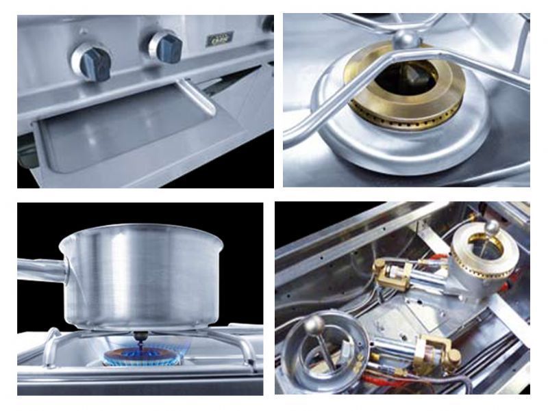 Le fourneau est équipé de 2 feux nus, chacun doté de brûleurs démontables en inox avec flamme pilotée et offrant une puissance de 7 kW. Les grilles en inox mesurent 400 x 600 mm, assurant une répartition uniforme de la chaleur. La cuvette emboutie et le tiroir de propreté facilitent l’entretien. La sécurité est renforcée par la présence d’une veilleuse et d’un thermocouple. Les manettes de commande sont sécurisées et protégées, garantissant une utilisation sans risque.