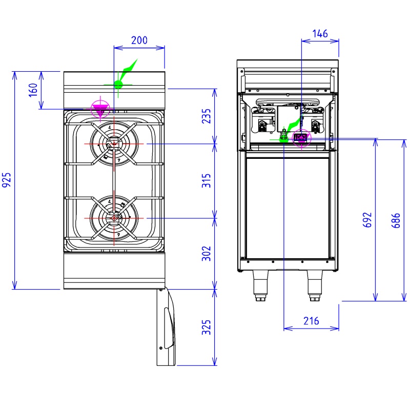 Ce fourneau présente des dimensions extérieures de 400 x 925 x 900 mm, fabriqué en acier inoxydable 18-10 brossé pour une durabilité maximale. Le dessus a une épaisseur de 30/10ème, tandis que l'habillage est en inox 10/10ème, et la structure en inox 20/10ème. Un piétement vérin composite de 150 mm réglable en hauteur garantit une stabilité optimale. Les bords avant sont tombés et rayonnés de 20 mm, tandis que le bord arrière forme un dosseret et une mitre d’évacuation, pour une sécurité et une fonctionnalité accrues. La façade sans vis apparentes offre un design épuré et un entretien facile.