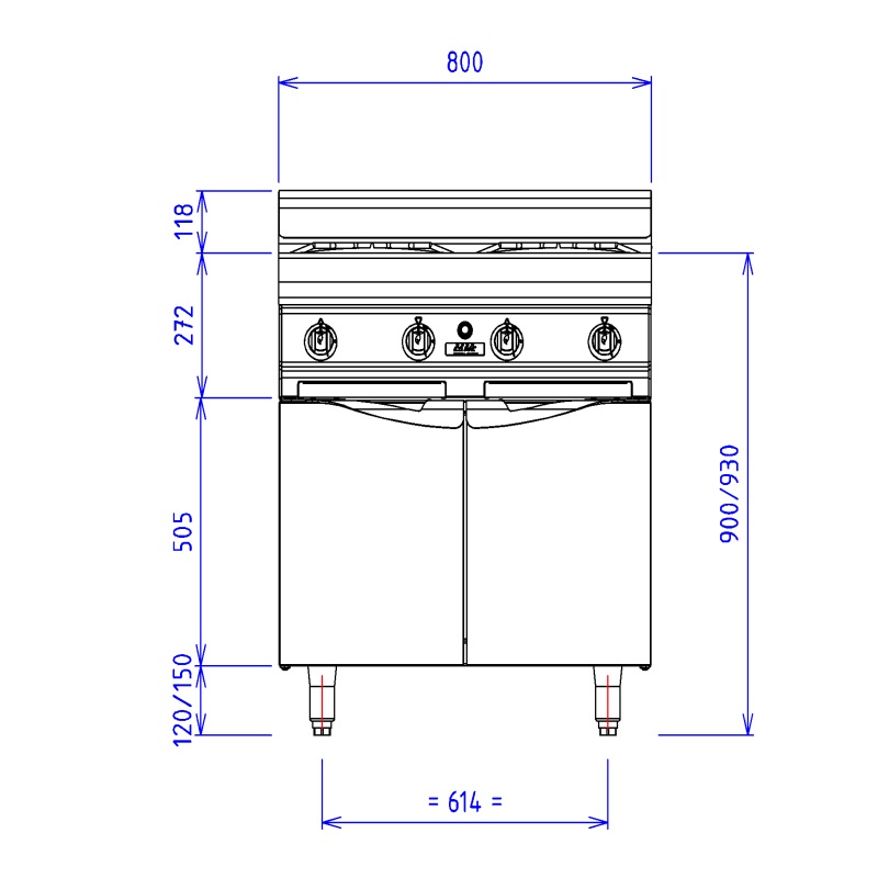 Les dimensions extérieures du fourneau sont de 800 x 925 x 900 mm. Le dessus est en acier inoxydable 18-10 brossé, avec une épaisseur de 30/10ème. L’habillage est en acier inoxydable brossé de 10/10ème, et la structure interne en acier inoxydable de 20/10ème. Le bord avant est tombé et rayonné de 20, tandis que le bord arrière forme un dosseret et une mitre d’évacuation, ajoutant à la sécurité et à l’efficacité du fourneau. La façade sans vis apparentes améliore l’esthétique et facilite le nettoyage.