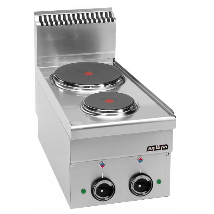 MBM vous propose une large gamme de fourneaux électrique. 2/4 plaques rondes Structure et plan de travail en acier inoxydable. Boutons ergonomiques résistant à la chaleur. Le profil des panneaux de coté permet daligner et de joindre les appareils entre eux faisant quune seule pièce. Cheminée en acier inoxydable. Les plaques en fonte permettent un chauffage rapide et sont munies dun dispositif de sécurité contre les surchauffes. Voyant de contrôle du fonctionnement des plaques.| Alimentation | Electrique |