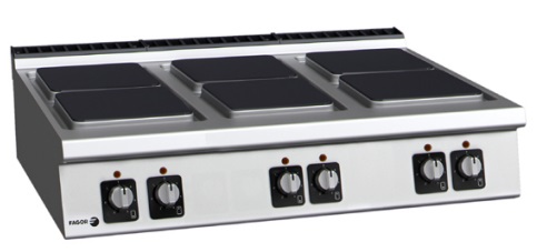 - Plaques de cuisson fabriquées en fonte, de 300 x 300 mm, de 4 kW de puissance, fixées hermétiquement au plan de travail embouti.