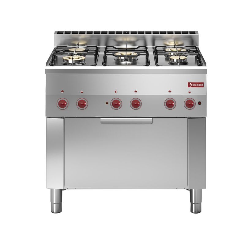 - Brûleurs avec couronnes en laiton à 'haut rendement', régulation par vanne gaz. Grilles supérieures en fonte émaillée.