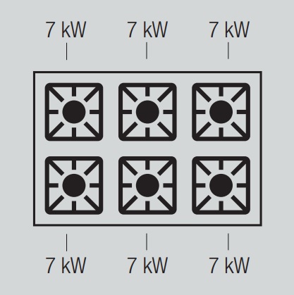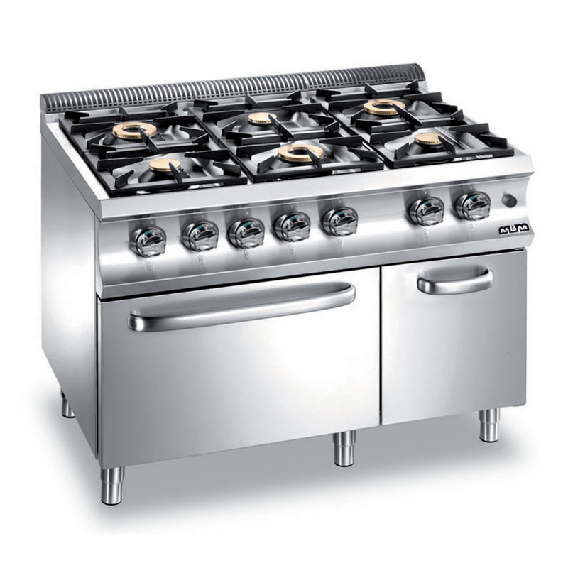 Le plan de travail emboutit de 45 mm de profondeur realisé en acier inoxydable AISI 304, permet une excellente circulation de l'air favorisant ainsi la performance des bruleurs, évitant les débordements des liquides, et simplifiant les opérations de nettoyage. Les bruleurs FLEX BURNERS amovibles en fonte et les chapeaux en laiton d'une puissance de 7 kW possèdent une flamme stabilisée. La flamme pilote est protégée et se trouve au sein de chaque bruleur. Les emplacements des bruleurs permetten l'utilisation des matériels jusqu'à 40 cm de diamètre. Les grilles de support casseroles peuvent être lavées au lave vaisselle. Versions sur four taille GN2/1 (gaz ou électrique): four double paroi en acier inoxydable, fond émaillé, porte en acier inoxydable double paroi avec isolation thermique. Cheminées en fonte. Le four gaz possède un bruleur de 6 kW (8 kW pour four maxi) à flamme stabilisée avec contrôle thermostatique de la température, vanne de sécurité et thermocouple. Allumage piezzo. Le four électrique est équipé de résistances blindées d'une puissance de 5,3 kW (2.6 pour le four ventilé) situées sur le haut et le bas de la chambre de cuisson. Contrôle thermostatique de la température indépendant haut et bas permettant de s'adapter à tous les besoins.