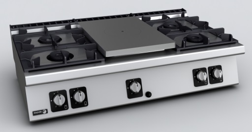 - Brûleurs et diffuseurs avec double couronne en fonte nickelée, garantissant l’uniformité de la distribution thermique sur tout type d’ustensiles, y compris de grandes dimensions, optimisant la production et la qualité du produit fini.