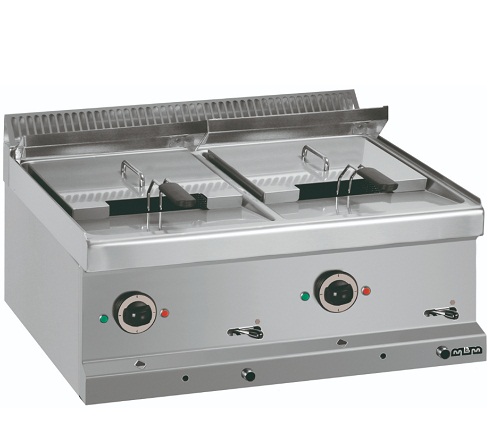 Le plan de travail est réalisé en acier inoxydable AISI304 18/10 d'une épaisseur de 1 mm. Les cuves sont en acier inoxydable AISI 304 18/10, moulées et avec des angles arrondis. Les cuves sont fixées par soudure continue pour faciliter les opérations de nettoyage. L'importante zone froide permet d'accroitre la durée de vie de l'huile et permet une récupération aisée des résidus de friture. Tous les modèles sont équipés de thermostats de sécurité ainsi que de thermostats de régulation (90-190 °C) permettant de conserver la qualité de l'huile. Un plan dégouttage est située sur le devant. Le système de recuperation est simple et sécurisé grâce au bac de récupération équipé d'un filtre inox. Version gaz avec bruleur interne: bruleur forte puissance à flamme horizontale, contrôle thermostatique de la température (90-190 °C), vanne de sécurité et thermocouple, allumage automatique avec flamme pilote et piezzo. Versions électriques: résistances blindées à l'intérieur de la cuve. Les résistances basculent pour simplifier le nettoyage. Contrôle thermostatique des températures.