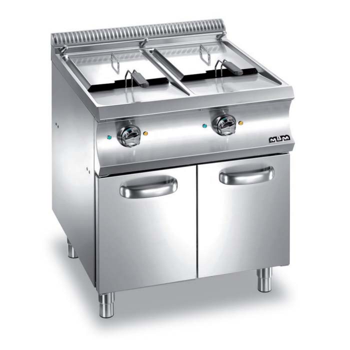 Le plan de travail est réalisé en acier inoxydable AISI304 18/10 dune épaisseur de 1,5 mm. Les cuves sont en acier inoxydable AISI 304 18/10, moulées et avec des angles arrondis. Les cuves sont fixées par soudure continue pour faciliter les opérations de nettoyage. Limportante zone froide permet d'accroître la durée de vie de lhuile et permet une récupération aisée des résidus de friture. Tous les modèles sont équipés de thermostats de sécurité ainsi que de thermostats de régulation (90-190 °C) permettant de conserver la qualité de lhuile. Un plan dégouttage est située sur le devant. Le système de récupération est simple et sécurisé grâce au bac de récupération équipé dun filtre inox. Version gaz avec brûleur interne: brûleur forte puissance à flamme horizontale, contrôle thermostatique de la température (90-190 °C), vanne de sécurité et thermocouple, allumage automatique avec flamme pilote et piezzo. Versions électriques: résistances blindées à lintérieur de la cuve. Les résistances basculent pour simplifier le nettoyage. Contrôle thermostatique des températures.