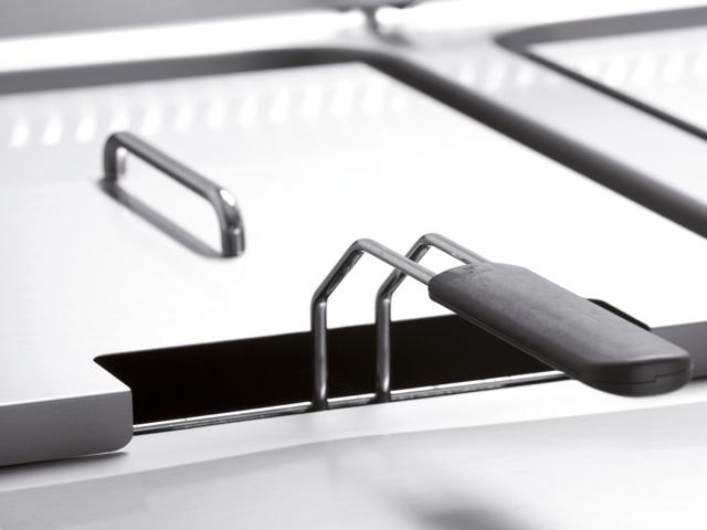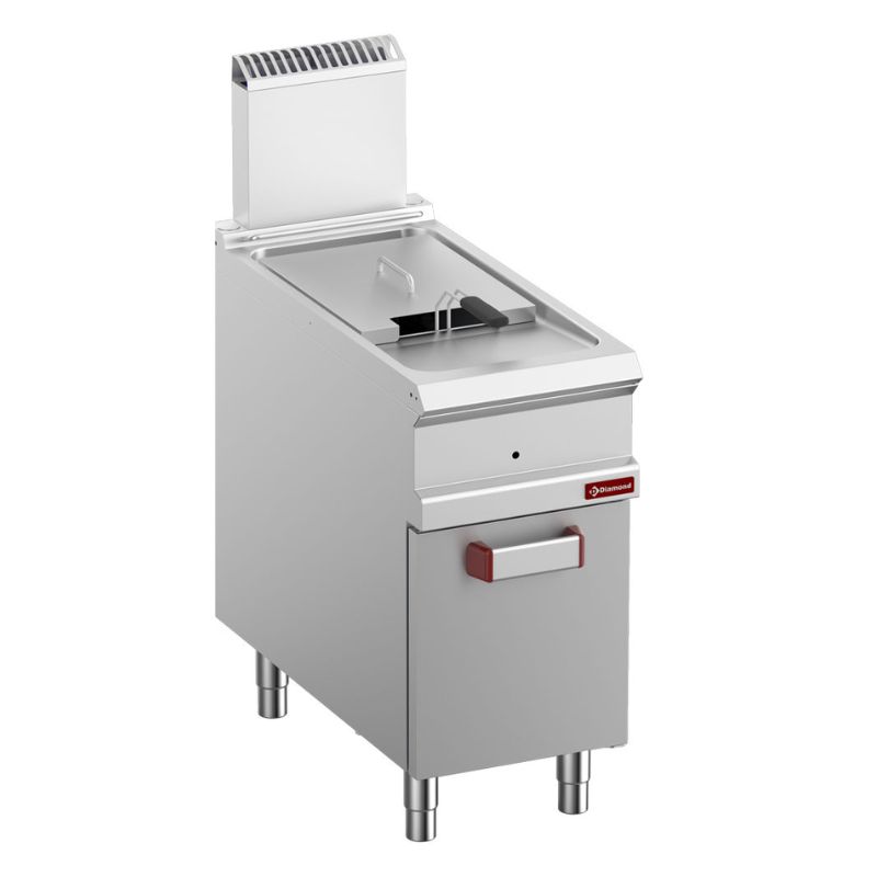 - Cuve 'emboutie' en acier inox AISI 304, coins et angles intérieurs arrondis, munie d'une zone froide, robinet de vidange (à billes) placé dans le meuble. Couvercle en acier inox. Bac pour décantation de l'huile, rangé dans l'armoire inférieure.