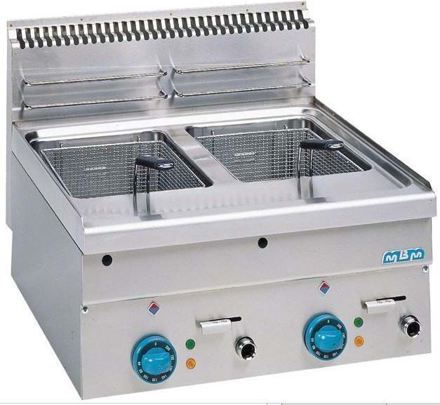 Gamme composée de 2 modèles top électriques et de 2 modèles top gaz. Fond de cuve avec zone froide et vidange de l'huile par robinet. Panier en acier chromé. Couvercle en acier inoxydable AISI 304. Chauffage Gaz: Brûleur haute performance avec flamme horizontale. Réglage thermostatique de la température de l'huile de 90°C à 190°C, sécurité par thermocouple. Allumage automatique avec veilleuse et piezzo-électrique. Avec thermostat de sécurité. Chauffage Electrique: Résistances Incoloy en acier inoxidable. Réglage thermostatique de la température avec voyant de contrôle du fonctionnement et de la température. Avec thermostat de sécurité.