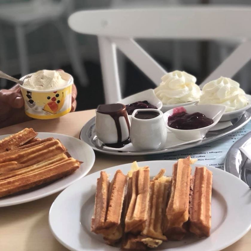 -Une délicieuse gaufre de Bruxelles sous la forme d’un frite, garnie de sucre en poudre ou chocolat servi dans un cornet de papier.