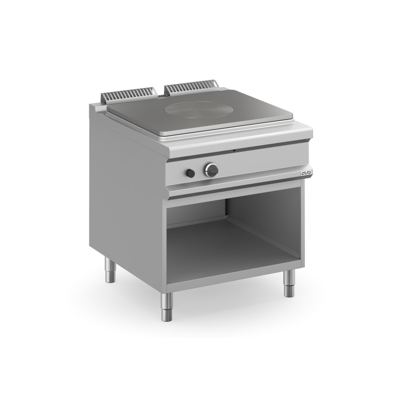 La plaque en fonte de 10 mm d'épaisseur a une surface de 50 dm2. Dans les versions à gaz, le chauffage est fait par un brûleur en acier de 12 kW, positionné en dessous l'anneau central mobile. Allumage piézoélectrique et contrôle thermostatique de la température. Plan de travail en acier inoxydable AISI 18/10 épaisseur 1 mm. Alignement de modules par juxtaposition. Dans les versions à fonctionnement électrique, la plaque est unique mais dispose de 4 zones de cuisson avec contrôle indépendant.