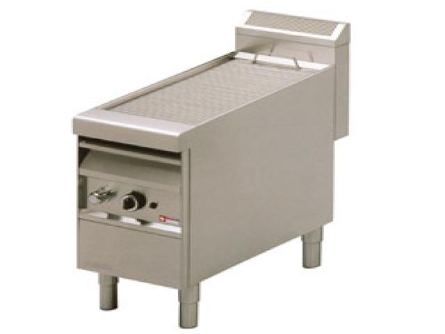 - Chauffage par brûleurs en acier inox à flamme stabilisée, placé en dessous de calottes en acier inox 'spéciale' qui ainsi transmettent la chaleur par rayonnement, cette caractéristique unique de construction a la faculté de garantir que la flamme vive ne soit jamais en contact avec les aliments.