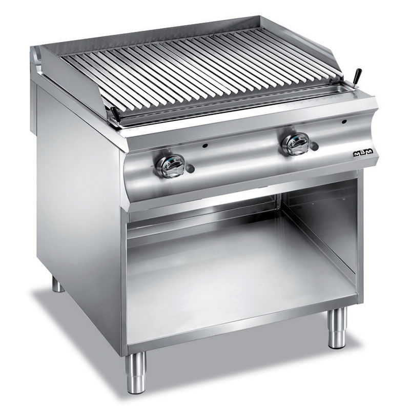 Le plan de travail est réalisé en acier inoxydable AISI304 18/10 d'une épaisseur de 2 mm. Grilles en acier inoxydable ajustables en hauteur par manettes de contrôle en façade. Tiroir collecteur amovible pour les graisses. Les bruleurs indépendants (modèle 80 cm) permettent différents types de cuisson.