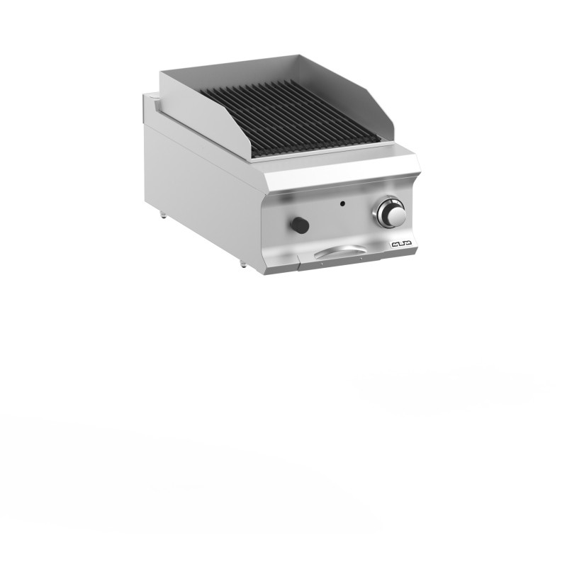 La grille de cuisson est en fonte réversible viande / poisson. Tiroir amovible en acier inoxydable pour la récupération de graisse. Dans les modèles de 80 cm, il est possible de créer cuisson différenciée grâce à des éléments chauffants indépendants.