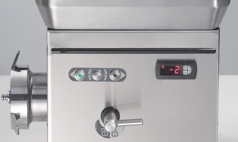 - Corps de la machine entièrement en acier inox AISI 304 - Moteurs puissants IP 55 autoventilés pour une utilisation continue - Réducteur en bain d’huile avec engrenages rectifiés - Réducteur avec double système de protection contre les liquides - Fixation pratique de la bouche avec levier verrouillé (CE) - Groupe de hachage hautement performant entièrement en acier inox - Col d’introduction carré offrant d’excellentes performances au deuxième passage - Trémie amovible verrouillée (CE) avec col allant jusqu’à la zone de hachage - Commandes inox IP 67 avec inversion (CE) - Système de refroidissement 150 Watts avec gaz R290 - Refroidissement au niveau du col, de la bouche et également au niveau de la trémie. Options : - Système de protection verrouillé pour l’utilisation de plaques avec orifice > 8 mm - Bouches Unger partiel ou total - Couvercle plexiglas sur la trémie - Machine pour hamburgers Format M.