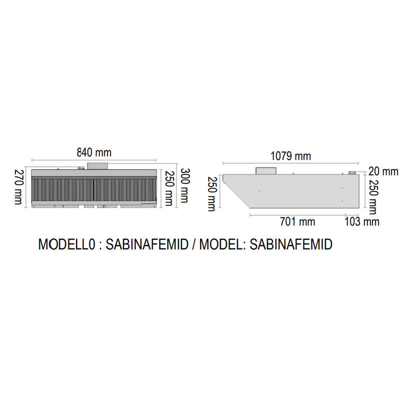 Les dimensions extérieures de la hotte sont de 840 x 1079 x 300 mm, ce qui lui permet de s'adapter facilement à divers environnements de cuisine.