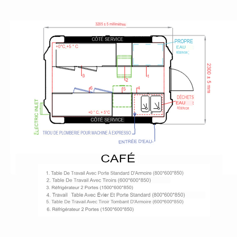 - Praticité : Équipé de multiples tables de travail, réfrigérateurs et un évier, ce kiosque est parfaitement configuré pour des opérations de café rapide.