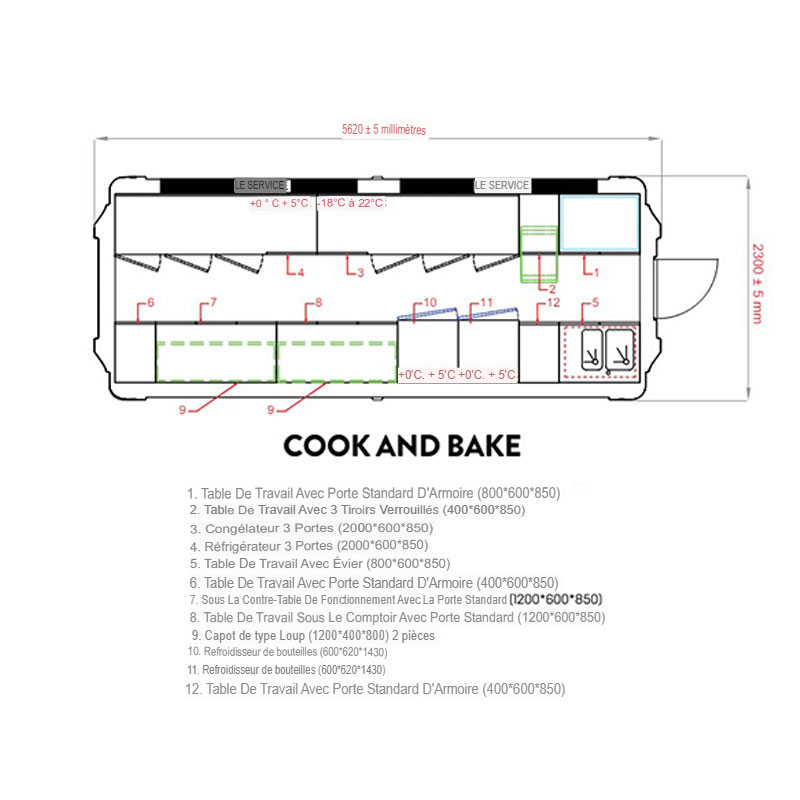 - Dimensions extérieures : 5620 x 2300 x 2400 mm
