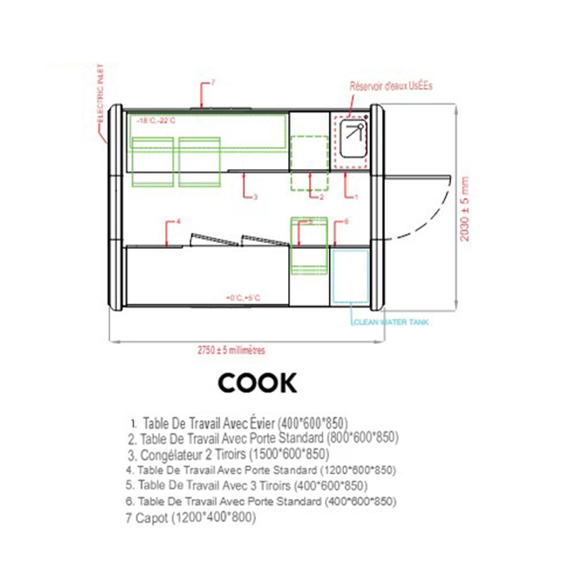 - Praticité : Équipé de multiples tables de travail, réfrigérateurs et systèmes de rangement, ce kiosque est parfaitement configuré pour des opérations de restauration rapide.