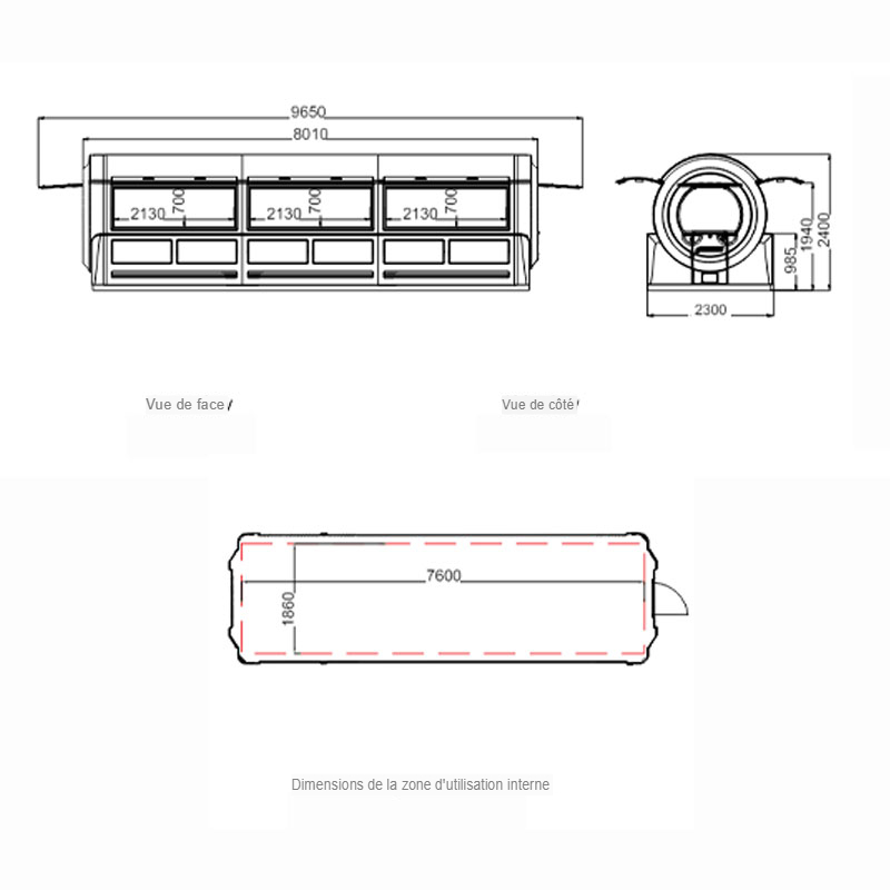 - Dimensions extérieures : 8010 x 2300 x 2400 mm