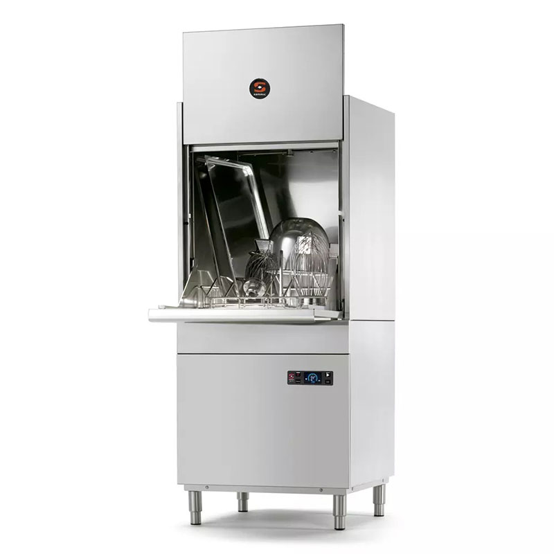 Le UX-600 combine une pompe de pression de 3 Hp (2200 W) et une cuve de 6000 W, permettant une pression de lavage intense pour éliminer efficacement graisses et résidus incrustés. Il propose 5 cycles de lavage de 120 à 480 secondes, et jusqu’à 30 paniers/heure en cadence maximale.