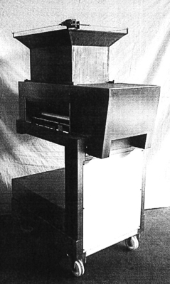 Matricule: A-5172 Année de fabrication: 2006 L'extrudeur de pate Mod. RON 1 fonctionne grace à un système à 3 rouleaux en acier inox: un rouleau canneleé d'alimentation diam. 200 mm. et deux rouleaux à la sortie diam.200 mm. (un rouleau à profil rayé et l'autre à profil lisse). L'extrudeur Mod. RON 1 est indiqué pour l'extrusion de pate brisée et similaires L'épaisseur de la pate peut varier de 4 à 30 mm.; elle peut etre réglée par un volant avec indicateur, placé à coté du groupe. La vitesse des rouleaux à la sortie est réglable de 0 à 8 m./min. par n.2 motovariateurs HP=1.5 ou par n.2 moteurs HP=2 à vitesse variable. La vitesse des rouleaux à la sortie doit etre réglée sur la base de la vitesse du convoyeur situé au-dessous, tandis que la vitesse du rouleau d'alimentation est réglée selon le type de pate à extruder. Le groupe extrudeur pate Mod. RON 1 est monté sur une structure indépendante en aluminium at acier inox, avec panneaux en acier inox et trémie révetue en PTFE, ayant une capacité de 60 dm3 environ; les parties en contact avec le produit sont en AISI 304 ou matériel non-toxique. La machine est montée sur des roues tournantes en matériel plastique. La gamme d'extrudeurs de pate Mod. RON1 comprend une largeur min. de 300 mm. et une largeur max. de 600 mm. et elle peut etre adaptée à n'importe quel type de ligne. Largeur rouleaux: de 300 mm à 600 mm Construction: acier + aluminum Puissance moteur kw: N.2 moteurs de 1,5 kw / N.2 motovariateurs de 1,1 Kw Classe d'isolation: 4 Classe de protection: IP 55 Fréquence/voltage/tours: 50hz/220v/1400 tours-min