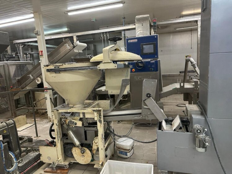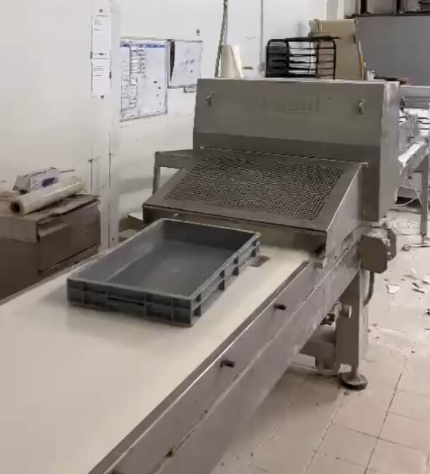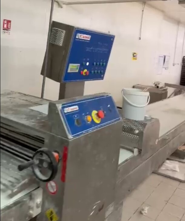 Matricule: A-5058 Année de fabrication: 2006 Le groupe de l'EXTRUDEUR A GRAS a été construit pour produire en continu une feuille de «grassur la partie latérale ou centrale d'une bande de pate précédemment extrudée. Le groupe est composé par: 1) CHARGEUR A TAPIS: les blocs de gras (pains) sont chargés dans la cuve de l'extrudeur (Hp 0.5). Les pains doivent etre positionnés sur le tapis, en s'assurant qu'ils soient appuyés à la guide latérale en matériel plastique du chargeur à tapis. Attention: positionner les pains de gras à une distance (X) qui ne soit pas inférieure à 60 mm. C'est important de respecter cette distance qui permet à la photo-cellule A1 de controler parfaitement la position des pains de gras et de pursuivre sans erreur les différents phases de positionnement et de onargement. Pour un bon rendement de votre chargeur à tapis pour pain de gras, la photo-cellule doit etre toujours propre et en conditions parfaites. La capacité du chargeur à tapis est de 4/5 pains environ (d'après la dimensione et le poids en grammes des pains). Une alarme (sonnette) s'active automatiquement après le chargement du dernier pain de gras et en signale l'absence sur le tapis du chargeur. 2) CARTERS DE PROTECTION: ils protègent l'opérateur du contact avec d'éventuels mécanismes en mouvement en prévenant les incidents. 3) TREMIE (cuve pressée): elle marche en symbiose avec les deux vis au-dessous et permet de passe à la phase de travail successive (Hp1+Hp4). 4) GROUPE DE PRESSAGE: il est controlé par un moteur auquel est fixé un disque en matériel plastique alimentaire ayant la fonction de presser sur les vis d'Archimède le matériel en travail. 5) GROUPE DOUILLE A LA SORTIE: il permet d'extruder une feuille de gras directement sur la bande de pate inférieure (épaisseur 10 mm - largeur max. 300 mm) Il est fixé sur la ligne principale et il est connecté à l'extrudeur par une séries de conduites en matériel alimentaire. Ce type d'extrudeur est indiqué pour travailler des blocs de gras (margarine ou beurre) à une température variable entre 8°C et 18°C, ou meme avec des mélanges de gras. 6) GROUPE D'EXTRACTION DE L'EAU; ce groupe a la fonction d'éliminer l'umidité qui peut se former pendant le travail. Longueur de la machine: 3500 mm Largeur utile: 415 mm Capacité de production: 350 kg/h Capacité trémie: 70 Lt Epaisseur sortie beurre: 10 mm Largeur sortie beurre: 300 mm max Vitesse: 1+8 m/min (avec moteurs à réglage potentiométrique) Puissance installée: 4 kw Fréquence: 50/60 Hz Volt: 220/380/415 v Construction acier: inox + aluminium