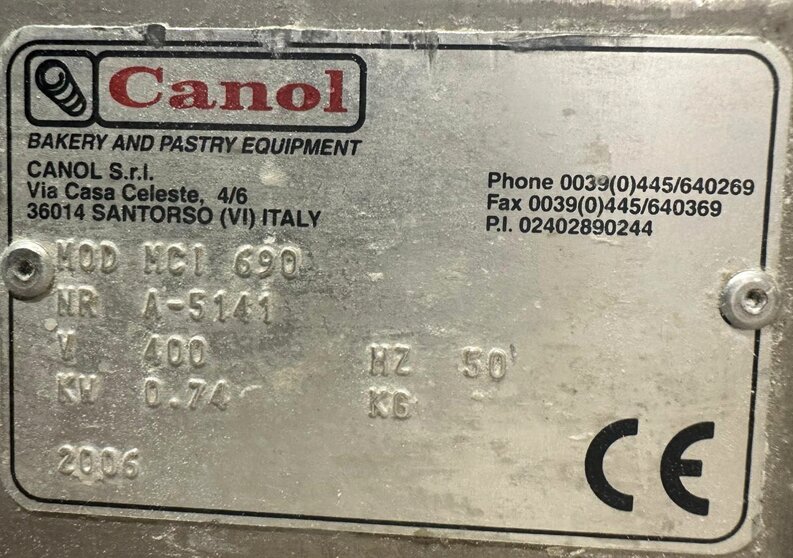 Matricule: A-5155 / A-5156 / A-5157 / A-5158 Année de fabrication: 2006 Le farineur est monté en général sur les tapis transporteurs, mais il peut être installé aussi sur les autres machines CANOL. Sa fonction est celle de saupoudrer la farine sur la pâte qui passe sur le tapis d'une façon homogène et dans les quantités et les positions vouluées. Le farineur est constitué par un bac avec agitateur interne contenant la farine; par une grille avec tiroirs de dosage; par un rouleau distributeur et par un motoréducteur d'actionnement. Un potentiometre à main permet de doser la quantité de farine qui sort du farineur. La largeur du saupoudrage est réglée par les tiroirs de dosage qui permettent une mesure maxi utile de 700 et une mini de 0. *CARACTERISTIQUES TECHNIQUES DU FARINEUR A PATE: Largeur du groupe: 970 mm Largeur utile: 700 mm Construction: acier inox / aluminium *CARACTERISTIQUES TECHNIQUES DU MOTEUREDUCTEUR: Puissance du moteur: 0,18 kw Polarité: 4 Classe de protection: IP 55 Fréquence/voltage/tours: 50-60 hz/220-260v/1400 giri-min Rapport de réduction: 1/60