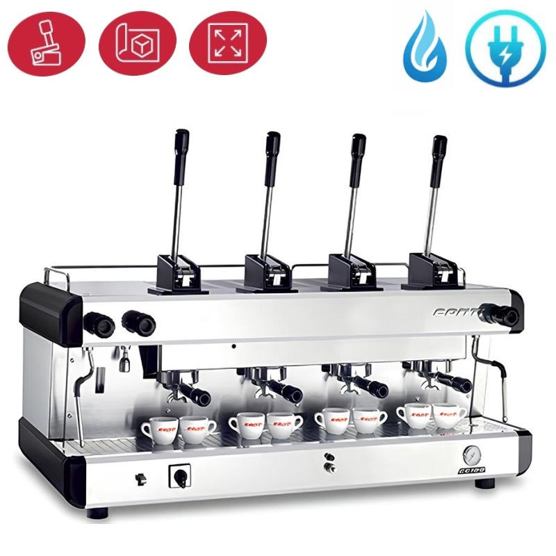 Découvrez la machine à café à levier 4 groupes CC100 PM Bi-énergie Gaz et électrique de la marque Conti, une solution d'exception pour les amateurs de café exigeants.