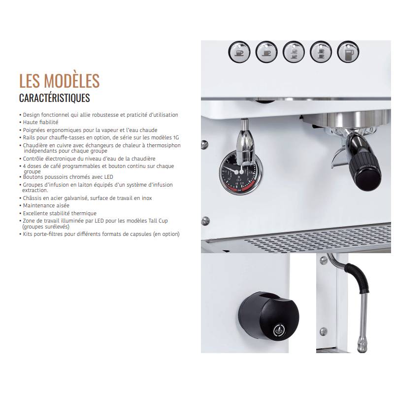 La Ottima Evo 2G FUTURMAT est dotée de 2 groupes, offrant une grande flexibilité et permettant de préparer plusieurs boissons en même temps. Les dimensions (LxHxP) de 710x420x520 mm la rendent idéale pour les espaces de travail limités. Poids de 49kg, elle est solide et durable. La capacité chaudière de 11,5L garantit une autonomie accrue.