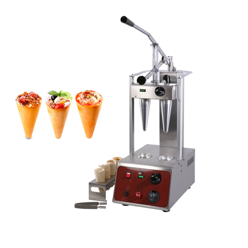 On vous présente un dispositif unique et facile à utiliser qui fournit la solution parfaite pour le secteur de fast food. La machine de moulage donne la possibilité de cuire la pâte en forme de cône dans un minimum de temps (1 minute) et donne la possibilité à l'utilisateur de rajouter dans la cône à façonner les ingrédients pour la pizza et de mettre le produit dans un four à air chaud pendant 4 à 5 minutes. Le dispositif est réalisé entièrement en acier inoxydable, a deux thermostats pour contrôler la température, minuterie avec avertisseur sonore, interrupteur général et lampes. Ce produit selon les normes internationales de sécurité.