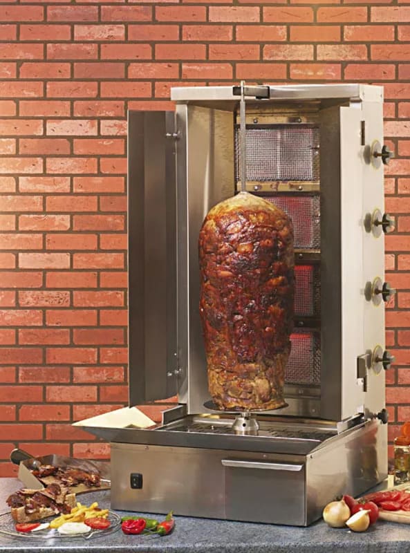 Le gril gyros gaz GR 80 G permet de cuire ou réchauffer une broche de viande kebab ou gyros de 40 kg grâce à 4 brûleurs infrarouges avec thermocouples de sécurité. Chaque brûleur gaz est réglable en grande flamme ou position ralentie.