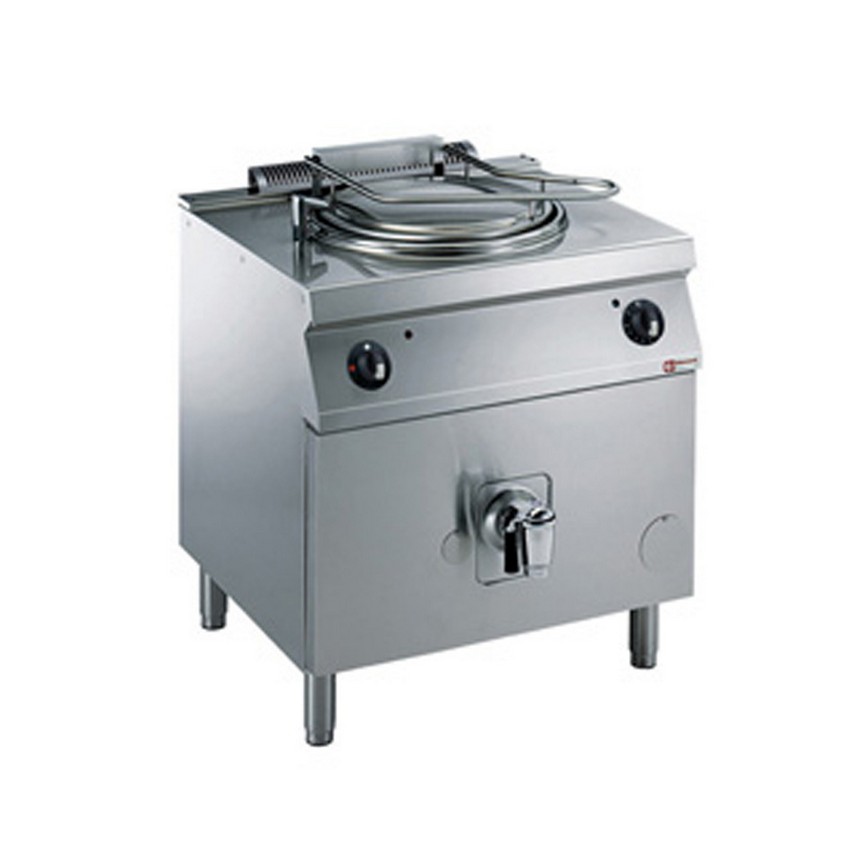 - Chauffage direct, cuve à double enveloppe, remplissage d’eau manuel. Deux robinets positionnés sur la façade avant de l'appareil, le premier pour l’ouverture, le deuxième pour le trop-plein. Contrôle de la pression de la double enveloppe par une soupape à 0,5 bar, avec un manomètre.