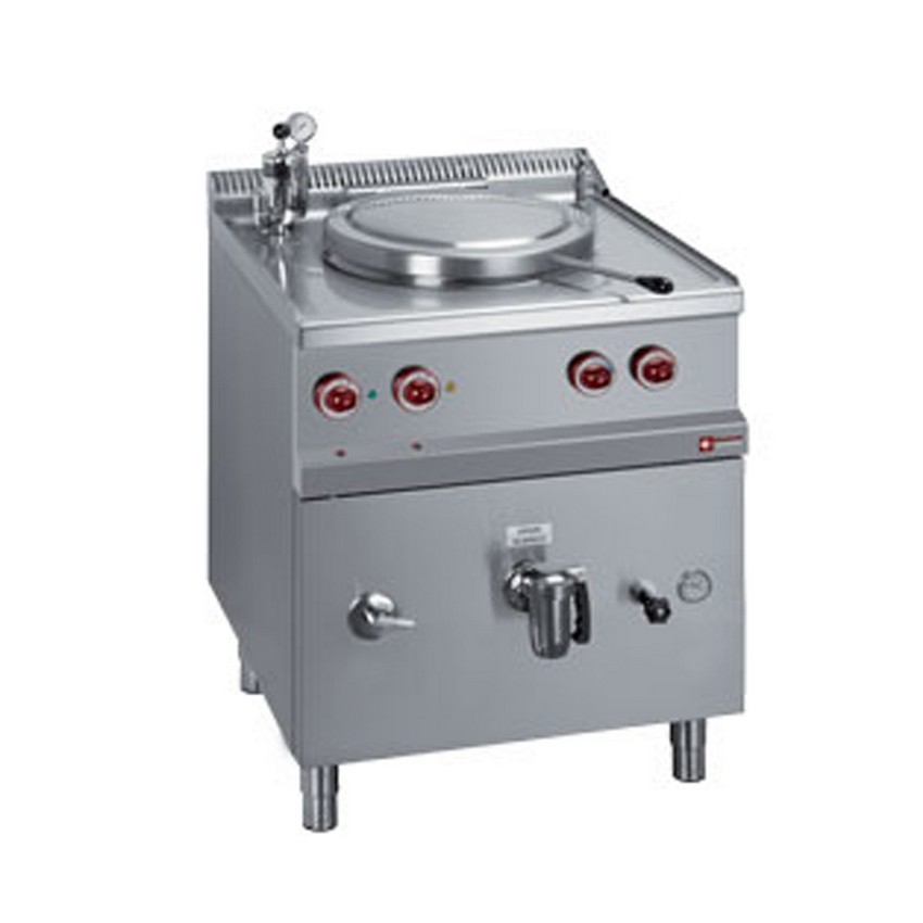 - Chauffage indirect, cuve à double enveloppe, remplissage d’eau par un robinet positionné sur la façade avant de l'appareil, un deuxième faisant office de trop-plein, permet de vérifier l'achèvement du remplissage. Contrôle de la pression de la double enveloppe par une soupape à 0,5 bar, avec manomètre et soupape de dépression.