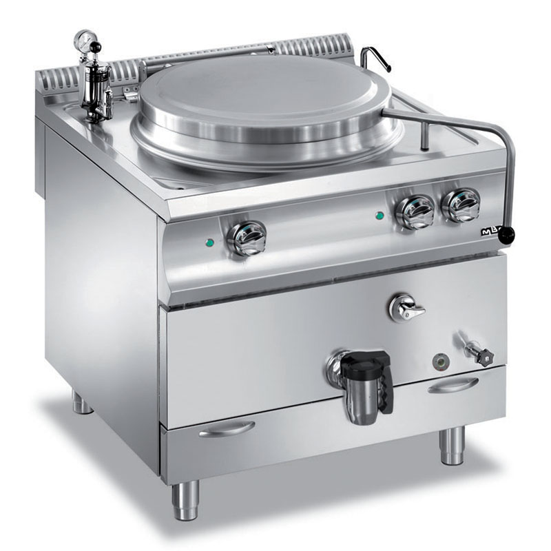 Le plan de travail emboutit à bords arrondis permet la récupération des liquides. La réalisation est en acier inoxydable AISI304. La marmite est réalisée en acier inox AISI 304, avec un fond en AISI 316 pour une meilleure résistance à la corrosion. Le robinet de vidange est équipé d'un filtre amovible. Robinet de vidange inspectable pour faciliter les opérations de nettoyage. Le couvercle en acier inox AISI304 permet d'éviter les pertes de vapeur et de chaleur. Robinets d'eau froide et chaude avec col de cygne sur le dessus. Version chauffe directe gaz: Bruleur en acier à flamme stabilisée. Version chauffe indirecte gaz (mod. I): Chambre réalisée en acier inox AISI304, bruleur en acier à flamme stabilisée. Flamme pilote avec vanne de sécurité. Allumage Piezzo. Manomètre de pression avec visualisation du niveau d'eau dans la chambre. Version chauffe électrique indirecte (mod. I): Chambre réalisée en acier inoxydable AISI304, interrupteur de puissance à 4 positions. Manomètre de pression avec visualisation du niveau d'eau dans la chambre. La vapeur basse pression située dans la chambre peut augmenter la température du matériel en surface.