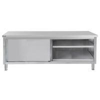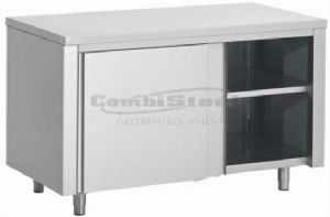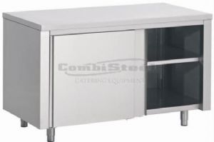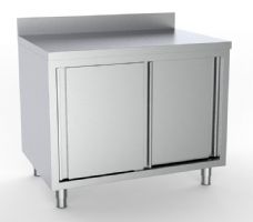 Typology : avec portes coulissantes Dimensions (mm) : 800 x 600 x 850 mm Plan de travail en acier avec dosseret de 40 mm d'épaisseur Dosseret h 100 mm Avec portes coulissantes et dos Étagère réglable